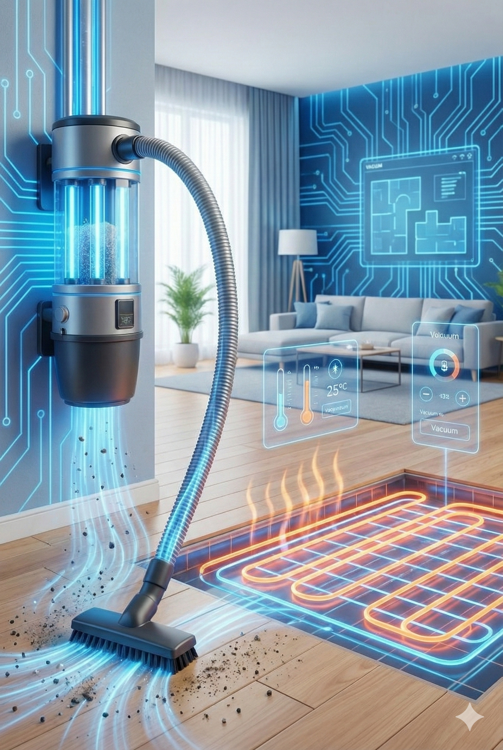 Soluções de piso térmico e aspiração central integradas ao projeto arquitetônico, garantindo aquecimento uniforme e limpeza eficiente sem ruídos ou equipamentos aparentes.