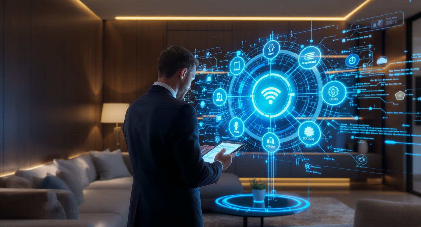 Automação inteligente que conecta luz, som, climatização, segurança e rotinas em uma experiência fluida e intuitiva.